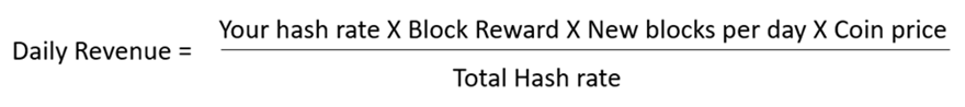 该公式可以表示为哈希率的总份额除以网络总发行量(以美元计)。所需的输入值要么是固定参数,要么可以在 Coin Metrics 和 Blockchain.com 等网站上找到。您还需要减去电费才能找到利润。千瓦和千瓦时之间的等价关系很简单,就是将设备功耗乘以电价。