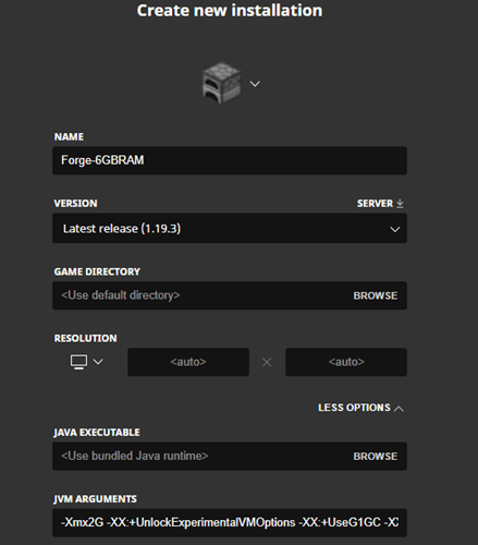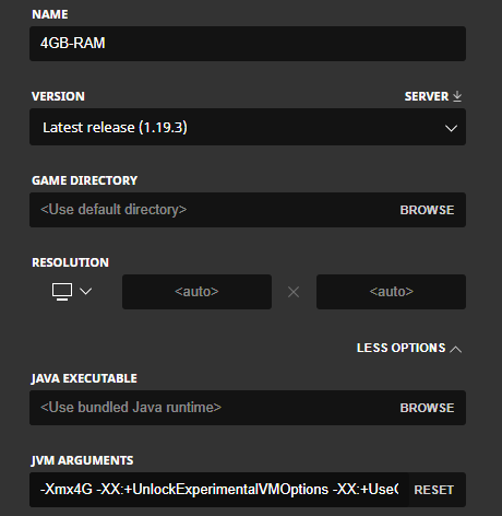 步骤 4) 点击“更多选项”,然后找到“JVM 参数”字段。在“JVM 参数”字段中,输入“-Xmx4G”(不含引号)。这会告诉 Java 虚拟机 (JVM) 为我的世界分配 4GB 内存。您可以根据需要调整要分配内存的 GB 数。