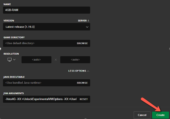 步骤 5) 在“JVM 参数”字段中,输入“-Xmx4G”(不含引号)。这会告诉 Java 虚拟机 (JVM) 为我的世界分配 4GB 内存。您可以根据需要调整分配更多或更少内存的数字。