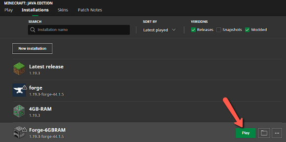 步骤 6) 从下拉菜单中选择新的启动配置,然后使用“播放”按钮。这将以分配的额外内存启动游戏。