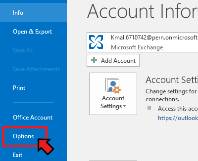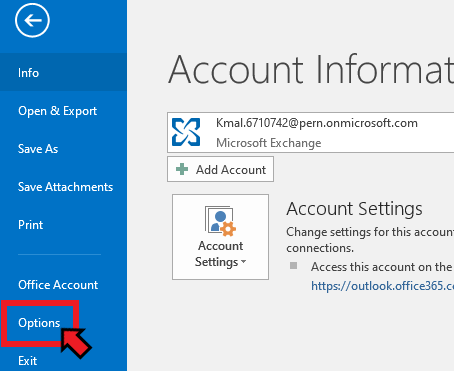 步骤 2)现在,从菜单中点击“选项”以打开 Outlook 选项弹出窗口。