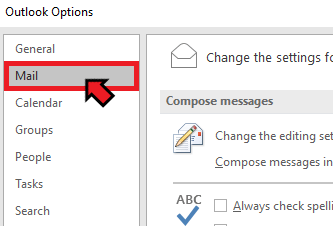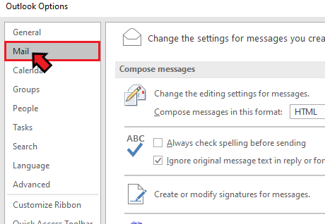 步骤 4)在弹出的“选项”窗口中点击“邮件”选项。