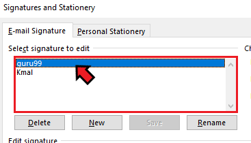 步骤 5)在“签名和信纸”窗口中,从“选择要编辑的签名”框中选择一个现有签名。如果没有,您可以创建一个。