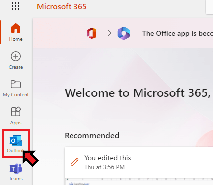 步骤 3)从“Microsoft 365”页面的左侧菜单中点击或轻触 Outlook 图标。这将带您进入您的 Outlook 帐户。