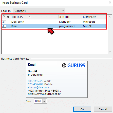 步骤 7)在“插入名片”窗口中,选择一个联系人作为名片添加到您的 Outlook 签名中。