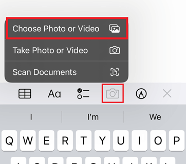 步骤3)按住键盘上方的小相机图标。然后,从抽屉中选择“选取照片或视频”。