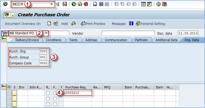 - 选择适当的采购订单类型:在我们的例子中是NB – 标准PO。