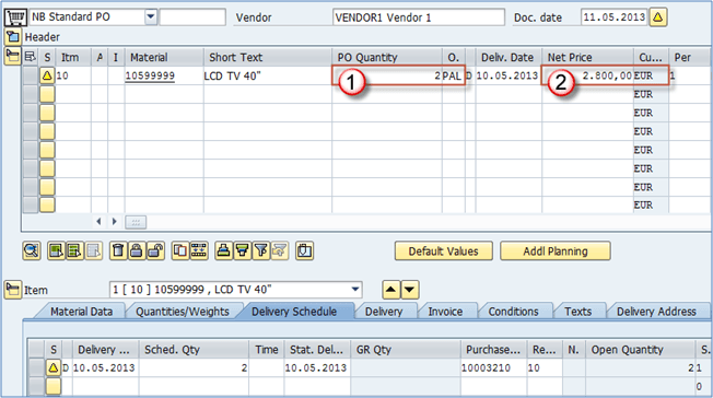 - PO数量:您可以看到PO数量被向下舍入为2 PAL。这是因为我们在PR中输入了30件,并且我们在信息记录中将订单单位设置为PAL,因此我们必须以托盘为单位订购,系统会自动向下舍入。