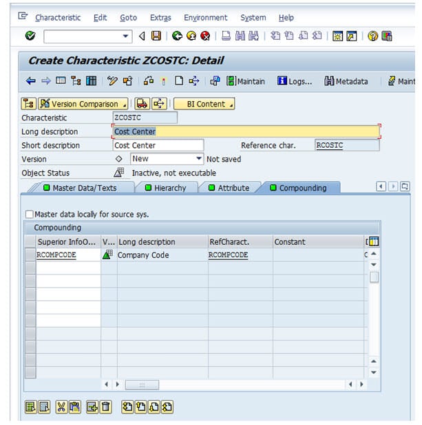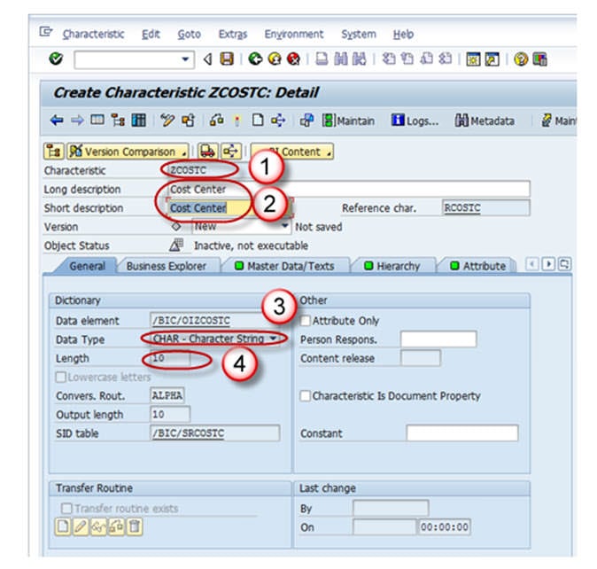 完成上述步骤后,您将进入 Infoobject 的“编辑屏幕”。Infoobject “编辑屏幕”有以下 6 个标签页。
