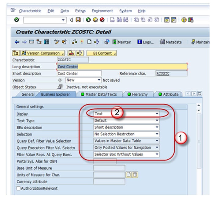 - 此页面上的 Display:“Text” 设置决定了是在 Business Explorer 中显示特征的值作为文本描述还是作为键。