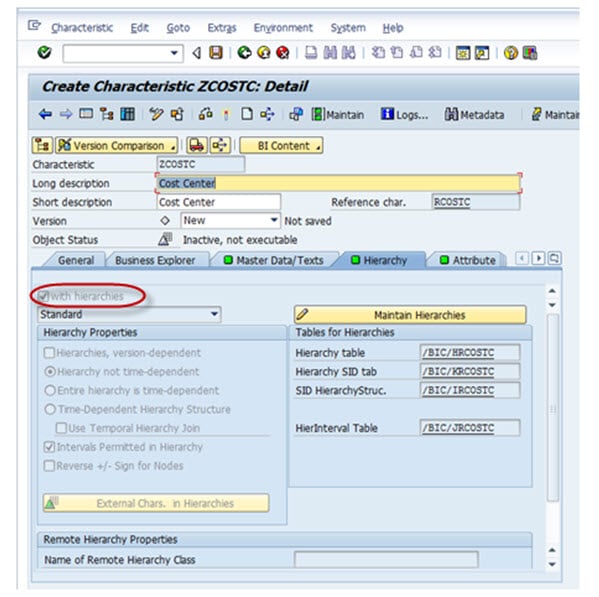 如果选中 **“With” hierarchies** 复选框,则可以为该特征创建层次结构。在下面的屏幕截图中,该复选框未选中,因此此信息对象未创建任何层次结构。