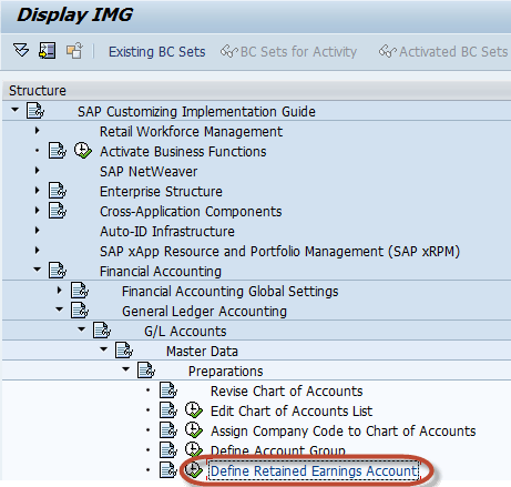SAP 定制 – 实施指南 – 财务会计 – 总账会计 – 总账账户 – 主数据 – 准备 – 定义留存收益账户