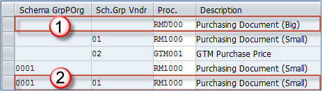 假设我们有一个采购组织 **0001**,分配给它的是**空白**(默认)方案组,还有一个采购组织 **0002**,分配给它的是方案组 **0001**(非默认)。