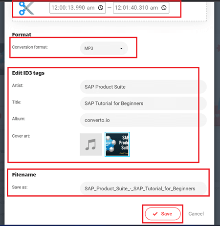 提示:它允许您剪切音频并仅下载选定的部分。您还可以选择格式、编辑标签和文件名。