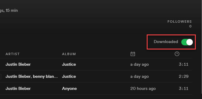 下载完成后,Spotify 桌面应用程序将显示“已下载”消息。