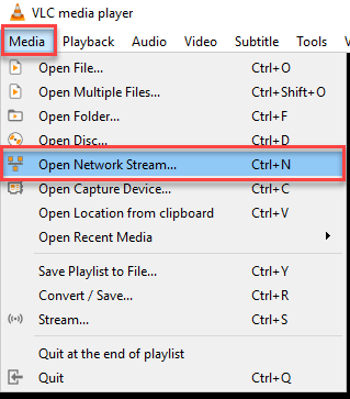 步骤 3) 转到“媒体”并点击“打开网络流”选项。