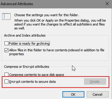 步骤 3) 在“压缩或加密属性”下,取消选中“加密内容以保护数据”复选框,然后单击 OK。