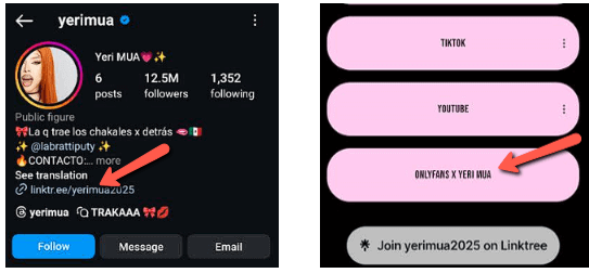Instagram 通常是追踪网红个人资料的关键。反向搜索图像可能会找到他们的 IG 帐户,其中的简介链接——无论是直接的还是通过链接管理器——都会显示其他平台,包括 OF。我曾通过这种方式从不相关的来源连接到照片。只需转到 IG 简介,找到链接,然后点击。此方法最适用于活跃的公共个人资料,并且对于寻求网红合作的企业特别有用。但是,如果您找不到任何链接,请检查标记的图像,并查看其简介中的线索。那是因为您可能会在他们的帖子、精选集和评论部分中找到暗示他们拥有 OF 帐户的线索。