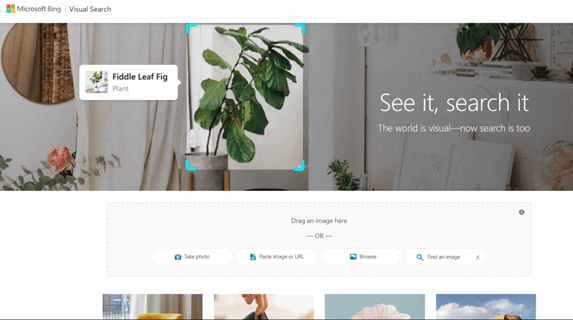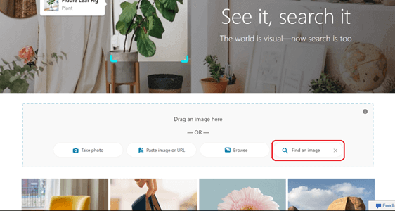步骤 1)在您的网页浏览器中访问 bing.com。然后,点击图片下的“查找图片”按钮并上传主题的图片。