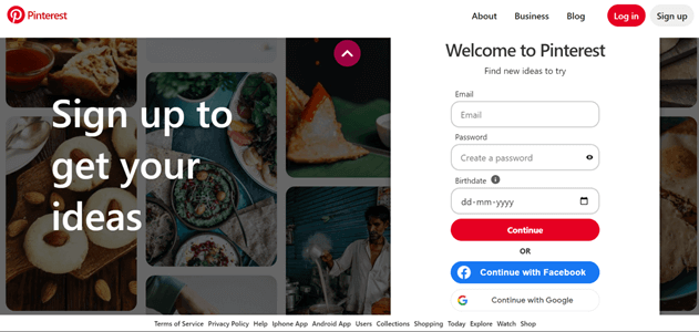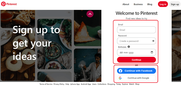 步骤 1)在您的设备上打开 Pinterest.com。在此创建一个帐户,或使用您的 Google 或 Facebook 帐户注册,如下图所示。