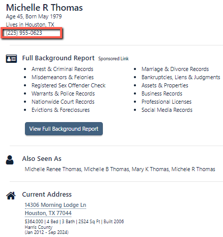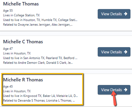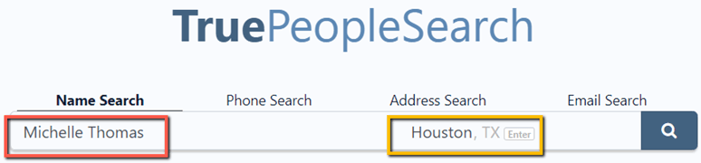 第1步)我访问了www.truepeoplesearch.com并在“姓名搜索”字段中输入了我表姐Michelle Thomas的名字。当我得知表姐搬到了休斯顿时,我在“地址”字段中填写了它。这是转折点!看到这些额外的详细信息帮助我锁定了正确的人,使整个搜索过程更加顺畅。