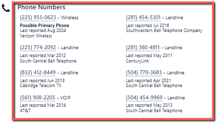 第3步)在查看搜索结果后,我找到了我表姐的电话号码和其他联系信息。它显示了所有电话号码,包括VOIP、座机和无线连接。我终于找到了我要找的东西,并能够轻松地联系到她,这让我松了一口气。