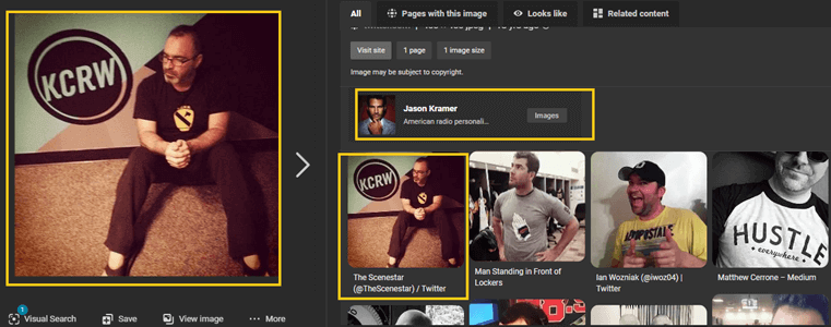 第 3 步) 这将在不离开页面的情况下快速启动反向图像搜索。它会描述图片中的人物和其他详细信息,如可用的照片、工作场所等。