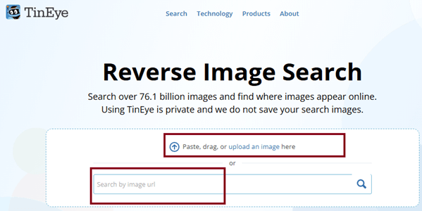 第 1 步) 在您的网页浏览器中进入 TinEye 网站。您可以在那里粘贴、拖放或上传图片。您甚至可以在提供的空间中插入图片URL。