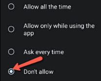 步骤 3) 这将带您进入应用程序的位置权限,您可以通过单击不允许来拒绝位置访问。