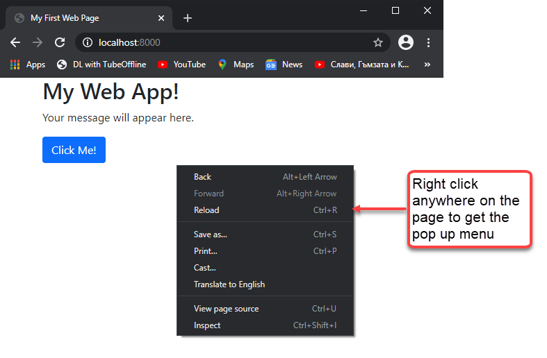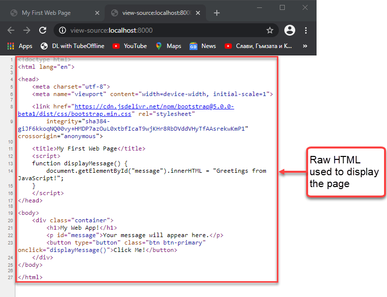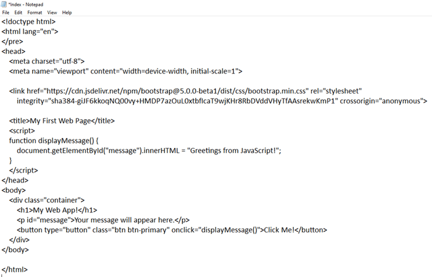 现在让我们创建一个简单的网页。在这里,我们创建了一个简单的 HTML 文档,并使用 Bootstrap CSS 应用了一些样式。我们还将有一个可点击的按钮,它将使用 JavaScript 显示一个简单的消息。