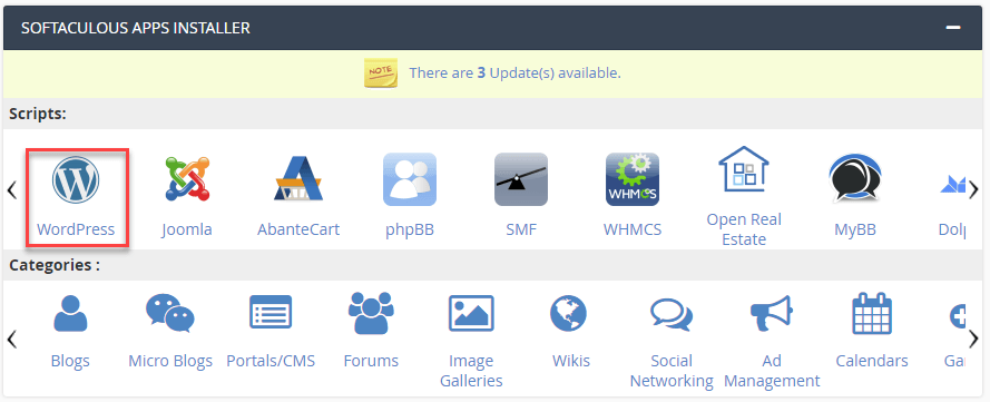 大多数 Web 托管提供商在管理面板中都有特殊的脚本,允许您安装 WordPress。如果您的托管提供商使用 cPanel,则您可以通过单击如下图所示的 WordPress 图标来安装 WordPress。