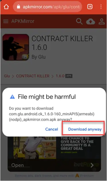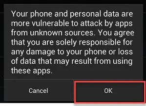 您将看到一个警告,提示您即将安装一个有害的 APK 文件。点击“确定”。