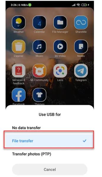 下载后,通过 USB 将您的 Android 设备连接到计算机。会弹出通知,要求您选择 USB 的用途。选择文件传输。