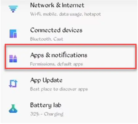 在您的 Android 设备(Android 8.0 及更高版本)上,转到“设置”并点按“应用和通知”。