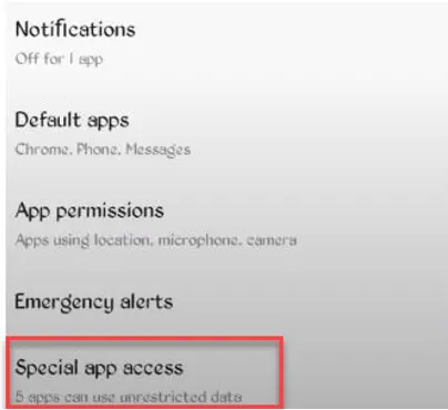 点击“应用和通知”后,向下滚动并点按“特殊应用访问权限”选项。