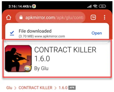 打开您的浏览器并找到您选择的 APK 文件。点按以下载它。您应该会在 Android 设备顶部栏看到下载通知。
