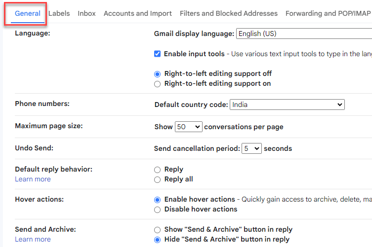- 选择查看所有设置选项后,您将进入一个新网页,其中包含您 Gmail 设置的所有设置和当前选项。