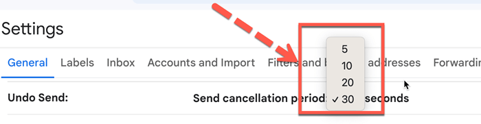 此选项有一个下拉菜单,您可以在其中选择 Gmail 的邮件取消时间段,最多可以设置为 30 秒。