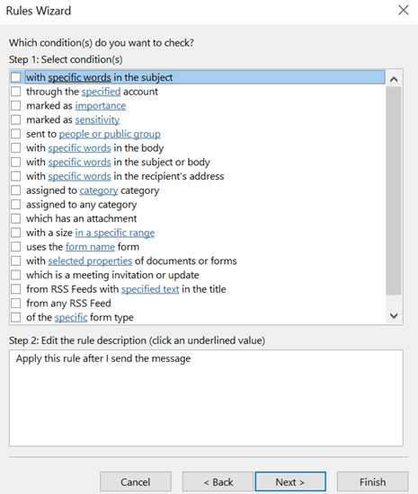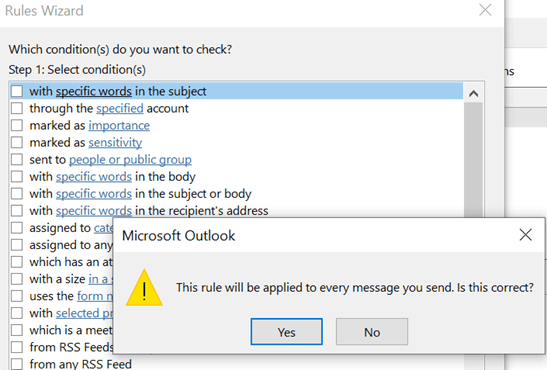 **第四步)** 点击“下一步”,并确认您是否希望规则应用于您发送的每条消息。