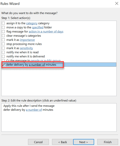 **第五步)** 点击“是”后,将弹出规则向导,您可以选择“**将传递延迟指定的分钟数**”。