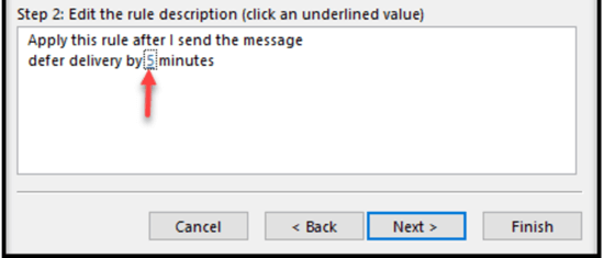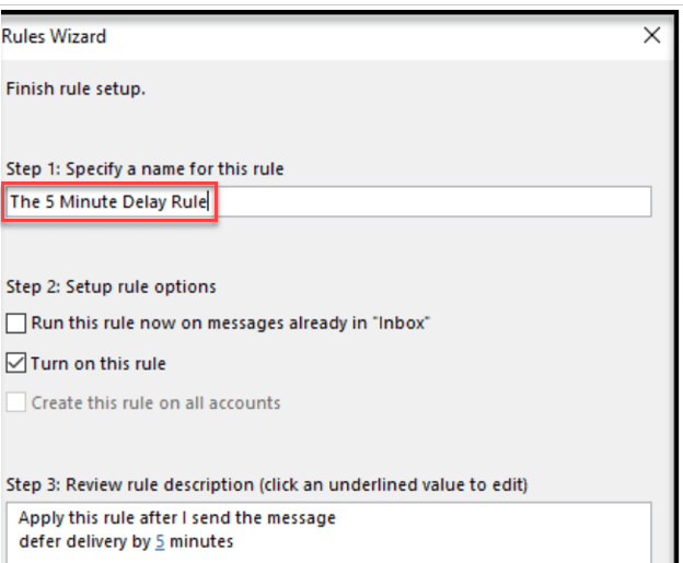 **第六步)** 设置延迟电子邮件的分钟数。在我们的例子中,我们选择了 5 分钟延迟。点击“完成”。