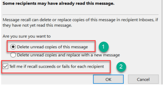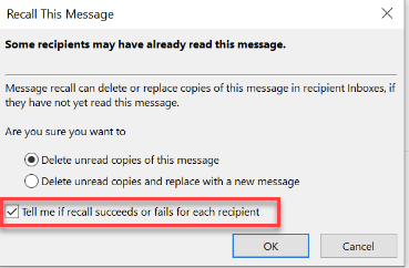2. 然后,勾选“**如果撤回对每个收件人成功或失败,请告知我**”,然后按“确定”按钮。