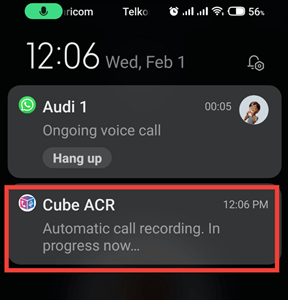 步骤 8) 在拨打电话时,Cube Acr 会在通知中显示正在录制通话。