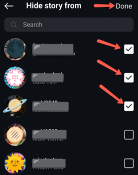 步骤 4) 你现在可以搜索并勾选你想要隐藏快拍和直播的个人主页,然后点击“完成”。