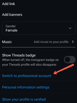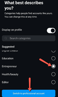 步骤 3) 从选项列表中选择你的账户类别,例如企业家、数字创作者、服装店等。然后,点击“切换到专业账户”按钮进行确认。