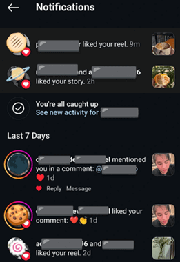 在跟踪者检查方面,Instagram 个人主页互动也能提供很多线索。爱心图标或通知标签可以显示你所有的点赞、评论、关注、快拍回复,谁使用了你的“添加用户”贴纸快拍模板等。