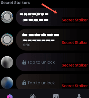 步骤 2) 登录后,你将能够立即看到你的顶级秘密跟踪者,如下图所示。要解锁其余部分,你可以给他们评分、观看广告或购买付费会员。