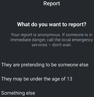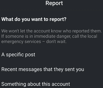步骤 3) 你可以选择“其他”或“关于此账户的一些事”来举报跟踪行为。