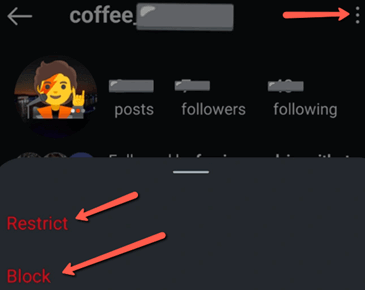 步骤 2) 现在点击出现的用户名,进入他们的个人主页。导航到右上角的三点菜单,然后点击“屏蔽”选项。要限制,只需点击“限制”。