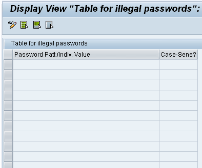 您可以阻止用户选择您不希望允许的密码。若要禁止使用某个密码,请将其输入到表 USR40 中。您可以使用事务 SM30 维护表 USR40。在 USR40 中,您可以根据需要泛型地指定不允许的密码。有两个通配符